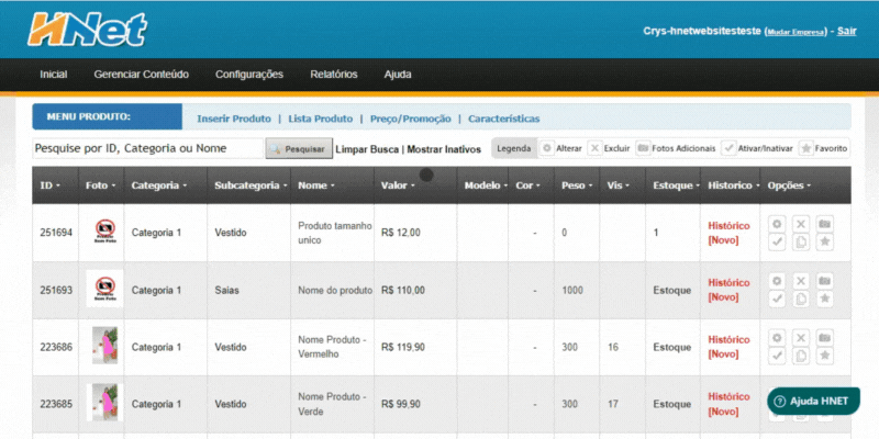 Para acessar o menu Gerenciar Conteúdo/E-commerce, selecione a opção estoque na faixa azul. Aqui serão mostrados todos os produtos cadastrados. Quando houver muitos produtos, é possível utilizar a busca por produto ou categoria.